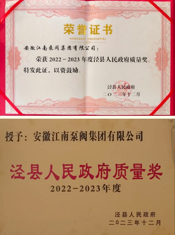 2月6日上午,涇縣人民政府副縣長盧勇,涇縣市場監督管理局局長衛景濤一行來到江南泵閥集團,送來了“2022-2023年度涇縣人民政府質量獎”銅牌和榮譽證書。公司總經理吳同茂,銷售副總吳瑞斌熱情接待。